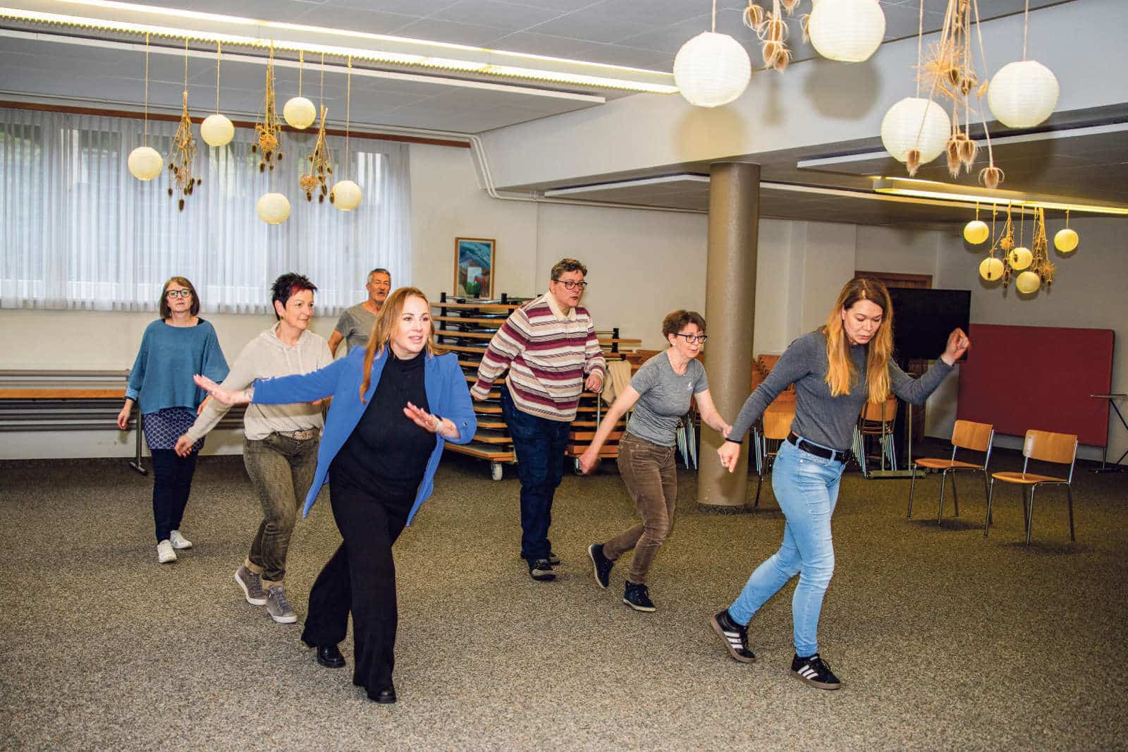 Nicht nur Alter und Aussehen einer Person sind entscheidend, ob jemand für eine Rolle geeignet ist. Auch Ausstrahlung, Auftreten und Dynamik müssen berücksichtigt werden, sowie das Zusammenspiel der verschiedenen Akteurinnen und Akteure. Deshalb stellte Christoph Schwager seinem Team verschiedenste Aufgaben. In zwei Gruppen mussten sie improvisieren, choreografieren und präsentieren. Die Spielleute schlüpften in diverse Rollen, stellten Situationen ohne Worte dar und tanzten gemeinsam einen Charleston. Es wurde herzhaft gelacht, immer mal wieder über den eigenen Schatten gesprungen und sich gegenseitig unterstützt. Da sich die meisten aus früheren Produktionen kennen und schätzen, war die Stimmung von Herzlichkeit und Verbundenheit geprägt. Alle freuen sich auf die intensive gemeinsame Zeit.
