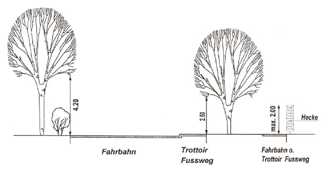 Die Grundeigentümer oder -nutzer sind gebeten, im Interesse der Verkehrssicherheit und Unfallverhütung diese Vorschriften zu beachten und sofern notwendig die Pflanzen gemäss Zeichnung aufzuschneiden.